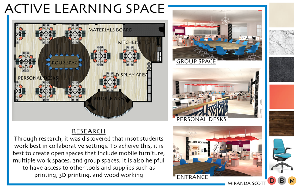 Through research, it was discovered that most students learn best in active and collaborative environments. This project showcases a remodeled version of the existing studio spaces at Ohio University. The new studios are meant to be functional and unique active learning spaces that promote creativity and collaboration. The spaces allocate for 60 student workspaces. The studios also include critique spaces, conference rooms, small and large group work stations, lounges, and maker spaces. To promote collaboration, open concept spaces, mobile furniture, and multiple group spaces were incorporated into this project.