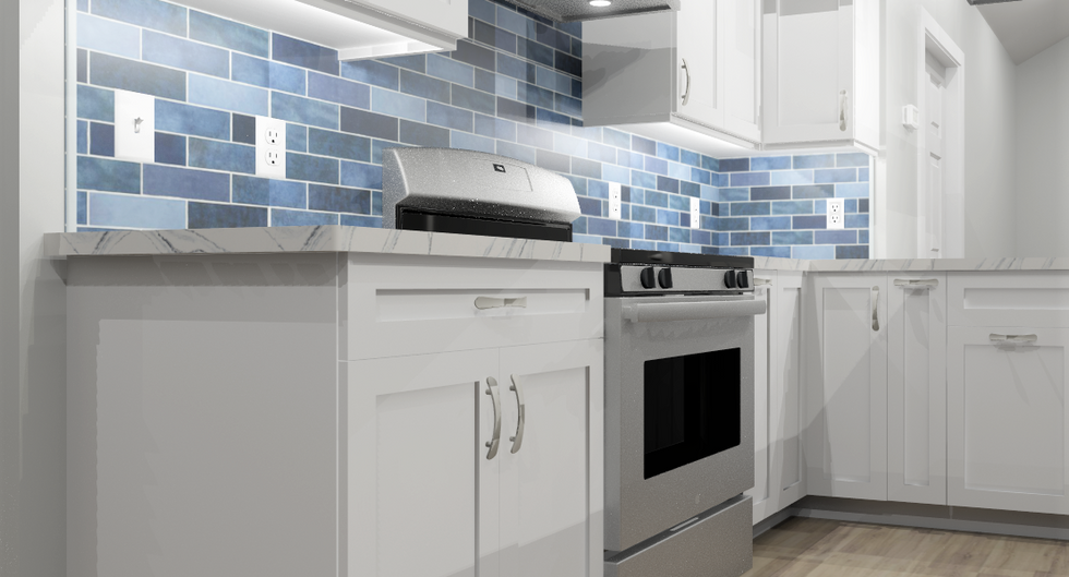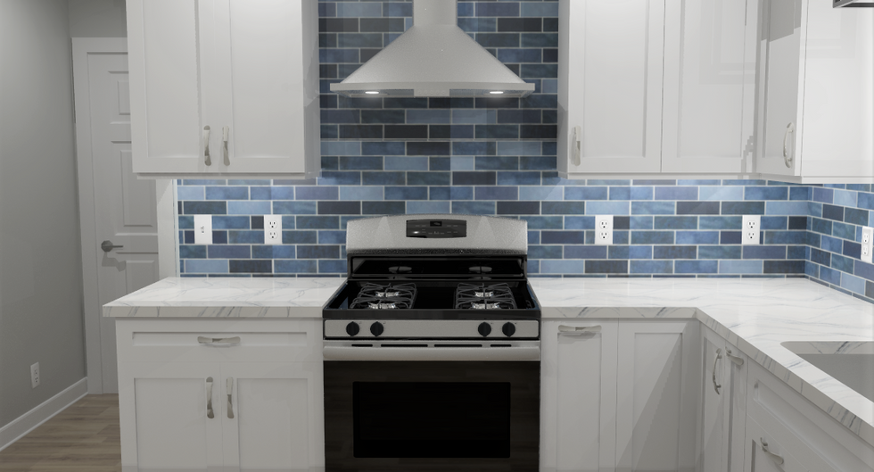 This project features a condo in the outskirts of Westerville. Having been built in the 1990s, this home needed some upgrades to their well used kitchen. With dark stained cabinetry, laminate countertops, and plenty of yellow tones, the homeowners felt that it was time to brighten and freshen up the space. To express the clients' love for blue tones, we used a blue tile backsplash and navy blue island. To top it off, the countertops were done in the beautiful Cambria Portrush.